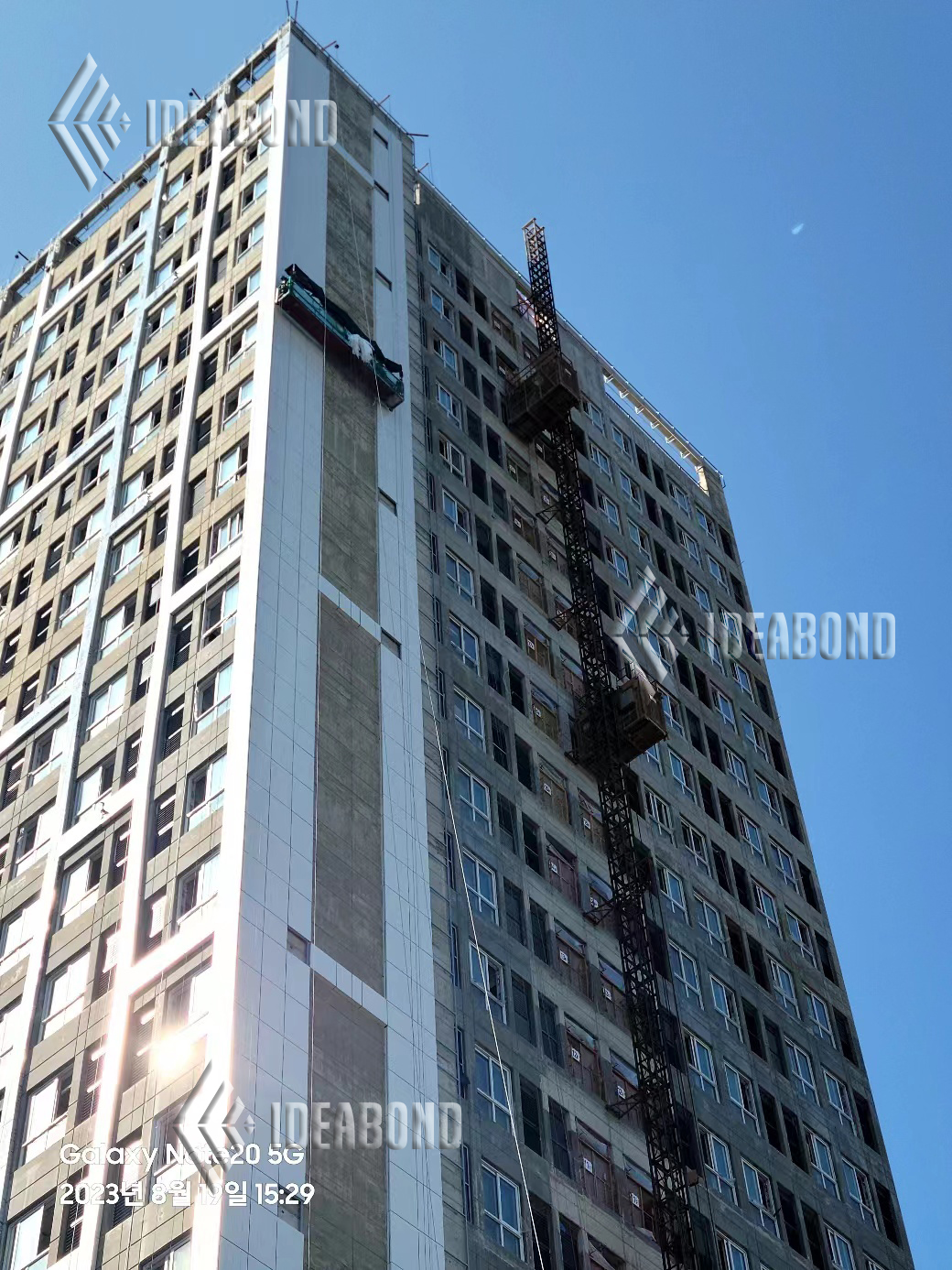 這是位於韓國的一處生活型住宿公寓,該項目總建築麵積41,576㎡,采用了(le)雅達利B1級(jí)防火鋁複合板(bǎn)作為建築外牆裝飾(shì)板。為了達到最佳的建築裝飾效果,鋁塑(sù)板的顏色選擇了AF-404氟碳啞白和AF-410鼠灰兩種配色。鋁塑(sù)板的尺寸為1220*2440mm,板材厚度為(wéi)4mm,鋁材厚度為0.50mm。